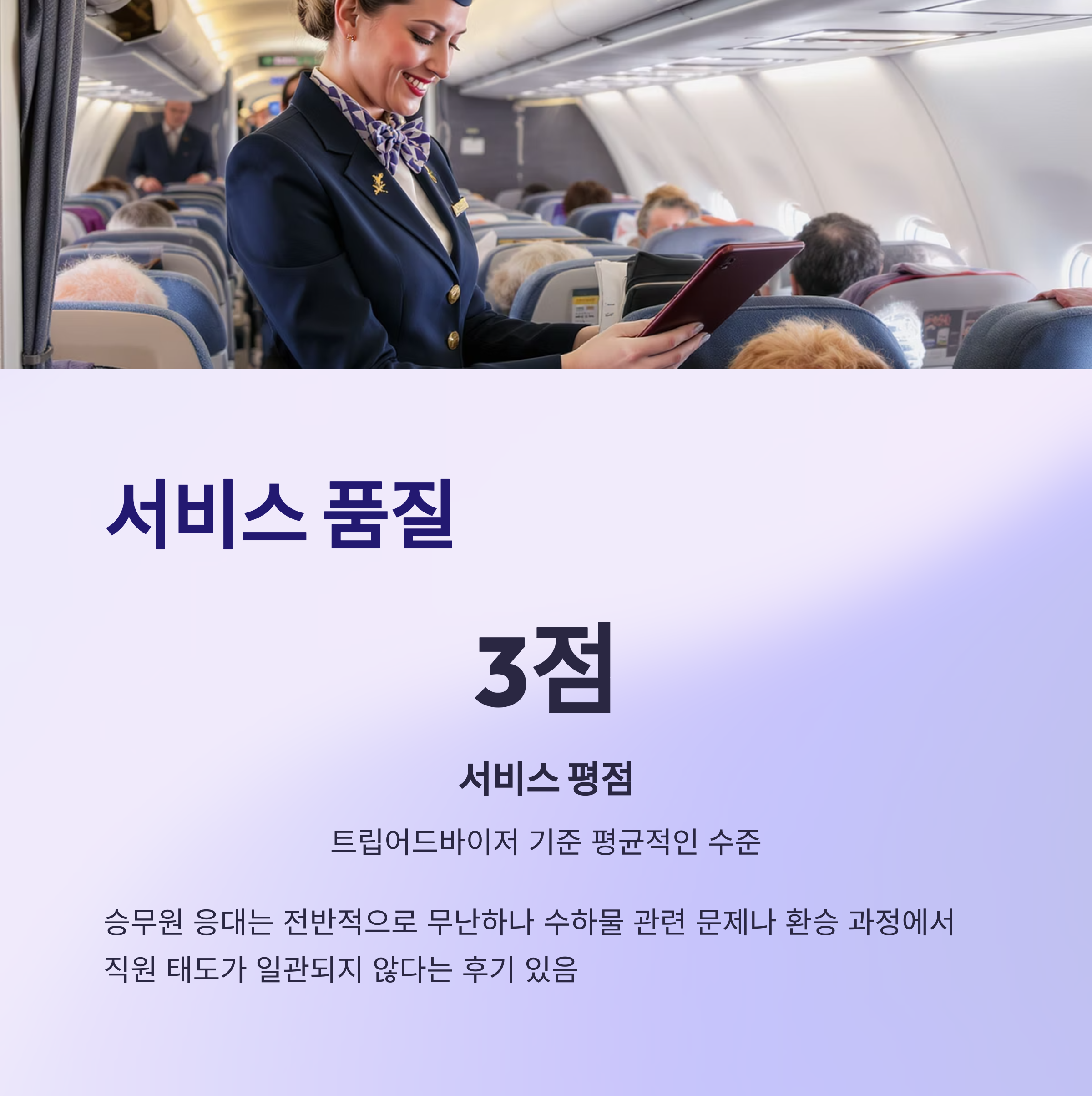 승무원의 응대는 전반적으로 무난하며, 트립어드바이저 기준