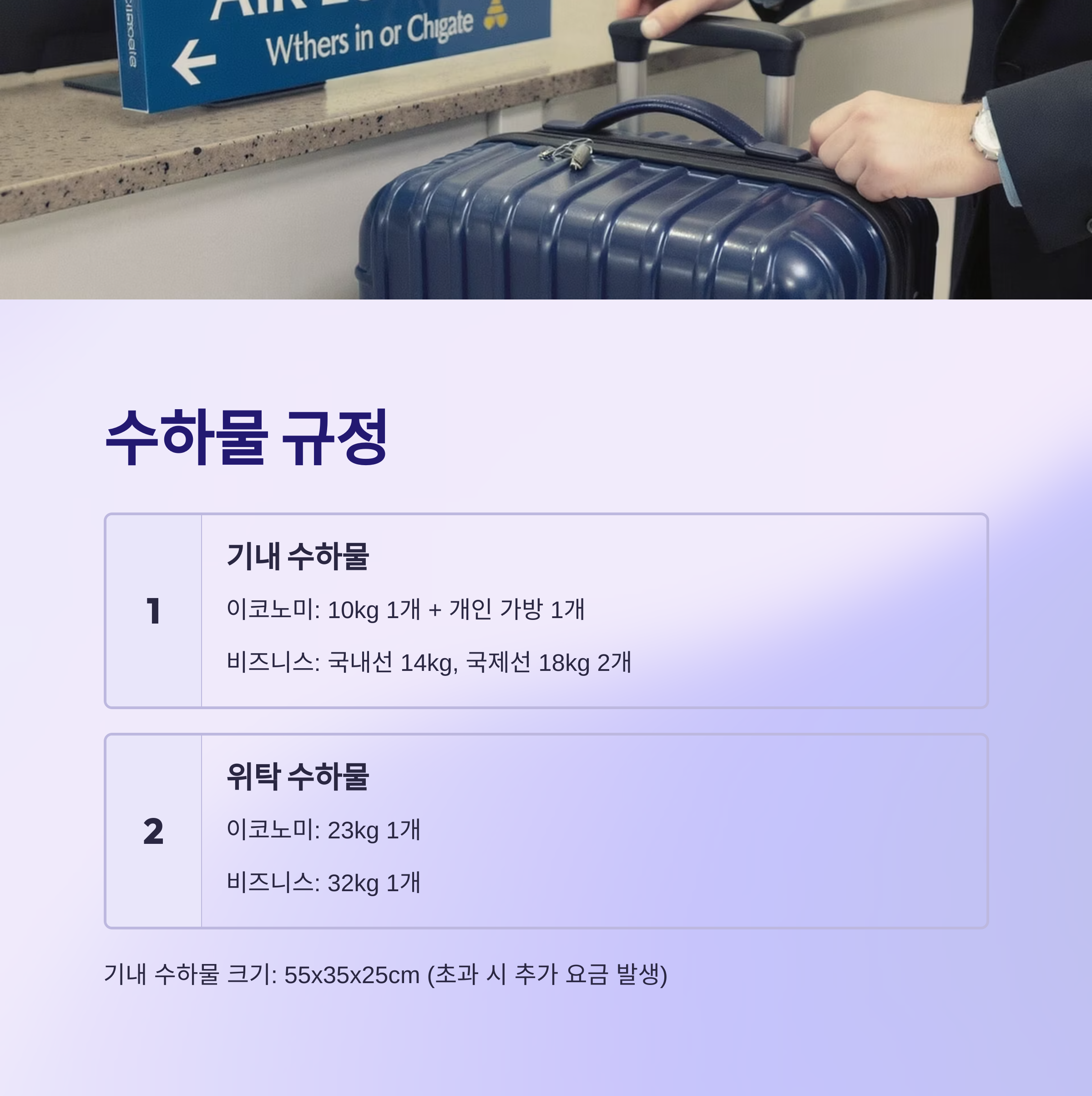 | 기내 수하물 | 10kg 1개 + 개인 가방 1개 | 국내선 14kg, 국제선 18kg 2개 |